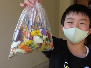 スズメがやって来てアドバイスしてくれました。「矢立(やたて)のホウレンソウを入れるといいですよ。」、「合戦原(かせばる)のミニトマトを入れるといいですよ。」。確かにこれは元気が出ます。大河内の矢立地区と合戦原地区からは、おいしくて栄養満点の野菜が出荷されています。