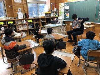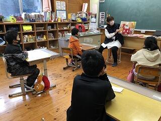 5・6年生には校長先生。子どもたちは神妙な表情です。なぜかというと、校長先生の読み聞かせは「外所(とんところ)地震」の紙しばいだったからです。「外所地震」は、400年ほど前に宮崎市木花の運動公園の辺りで大きな被害を出した地震です。読み聞かせの日は、阪神・淡路大震災のあった日でした。