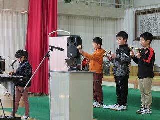 子どもたちに負けじと、家庭教育学級生「ママーズ&おやじーズ」による「明日があるさ」の合奏です。仕事の合間をぬって練習を積み重ねてこられました。写真で見ると表情はカチコチですが、演奏はバッチリ大成功でした。