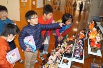 雛飾りの前で、子どもたちが、「あかりをつけましょ、ぼんぼりに・・・・・」と、歌「うれしいひなまつり」を歌いながらながめていました。