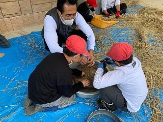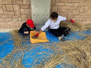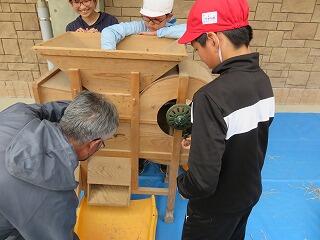 地域の方に講師になっていただいて、昔ながらの道具を使って脱穀します。珍しいのが「千歯こぎ」です。社会科の教科書で見ることはあっても、実際に体験する機会はなかなかありません。