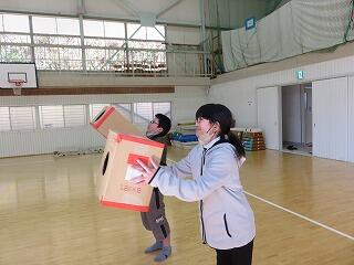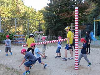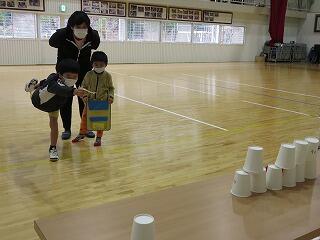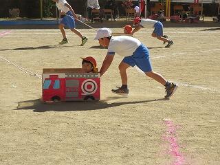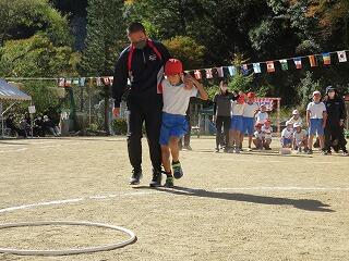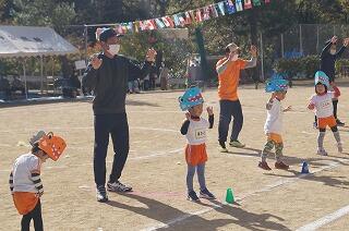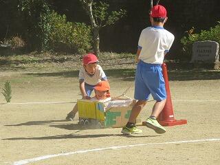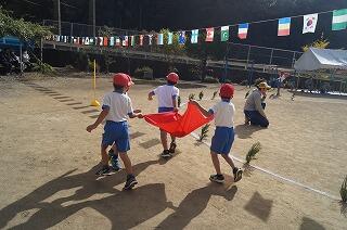 小学生と保育所生の団技。年長さんは棒をもって、年中さんはフープに入って、年少さんは特製の車に乗って、コーンを回ります。特製の車に乗る年少さんはご満悦で、ニコニコです。