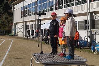 児童代表のあいさつは、1年生と保育所年長さんの3人でほほえましく。選手宣誓は、高学年がビシッと。