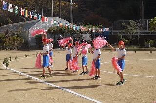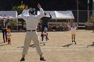 保育所生のダンス「やんちゃ怪獣どっか~ん」。保育所生たちもドッカーンとはじけていましたが、一緒に踊るお家の方々もはじけまくっていました。キレッキレのジャンプ!