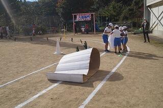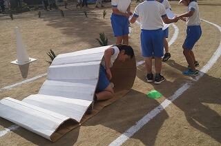 小学生の団技。「台風の目」→「キャタピラ」→「ボール運び」→「二人三脚」→「玉入れ」と、盛りだくさんの種目をリレーしていきます。団長はキャタピラを務めてヘトヘトですが、玉入れまで全力です!