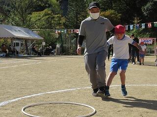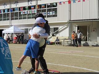 親子団技。二人三脚した後に、抱き合って風船を割り、子どもをおんぶして帰ります。ちょっぴり照れ笑いでも、子どもたちはずっと笑顔。風船がなかなか割れないほど何度も抱きしめ合うので、見ている方も、温かい気持ちで笑顔になりました。