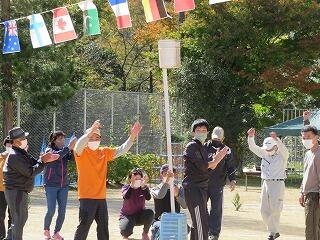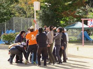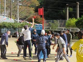 地区の皆さんの競技、玉入れです。玉を全部入れた方が勝ち、のルール。白熱の勝負は、白団の勝ち。バンザイ!