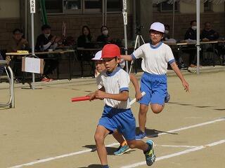 最後の種目、全員リレー。注目してもらいたいのは、バトンパスの技術です。もらう瞬間、後ろを見ている子は1人もいません。スポーツ少年団も含めて、日頃の練習のたまものです。