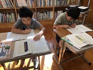 今日は国語のお勉強。声を出して教科書を読んだり、参考になる文章をノートに書き写したりしました。