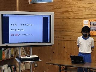 「伝えタイム」をしました。学習したことの中から、全校のみんなに「伝えたい!」と思ったことを伝えます。今回は高学年の担当です。