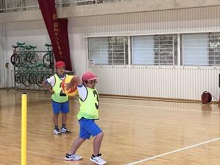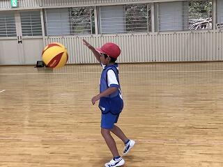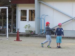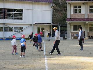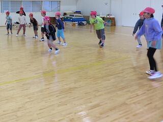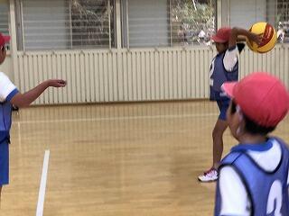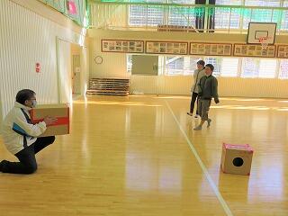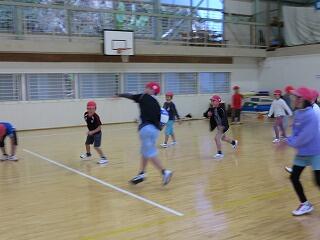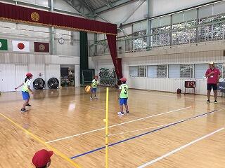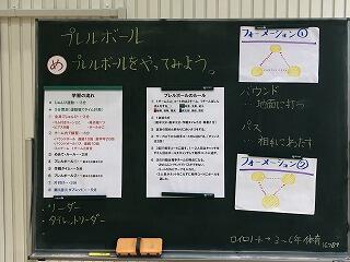 体育の時間。3~6年生が合同で「プレルボール」をやっていました。