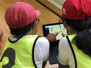体育でもタブレットパソコンを使っていました。コート内でのポジションを、画面上のキャラクターを移動させて確かめ合っていました。子どもたちは、ノートやホワイトボードと同じような感覚で使っています。時代は進歩しています。