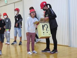 空気がパンパンに入れられたボールは、高く飛び上がる上に、弾む弾む!サッカーが上手な校長先生も、ヘディングとは勝手が違って大苦戦。かごにボールが入っても、弾んで飛び出してしまいます。やっている方は大変ですが、子どもたちも観客の皆さんも大盛り上がりで声援を送りました。