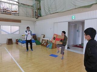 体育館でマット運動をしていました。「逆さまになる感覚」や「転がる感覚」を鍛えることができます。