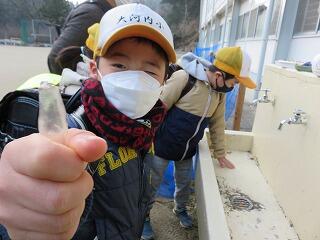 子どもたちは元気に登校してきました。登校そうそう「蛇口につららができてますよ!」