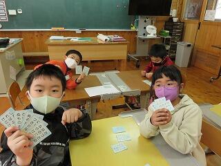 1・2年生が、お正月らしい遊び、かるた(百人一首)をしていました。