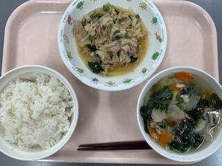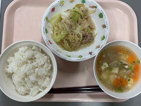 豚肉は小さく切ってあり、柔らかくてしょうがの風味もきいていて食べやすかったです。もやしや玉ねぎの食感もよく、食べていて楽しめました。春雨スープは、煮干しだしとベーコンのだしがよく出ていて、優しい味でした。春雨や野菜がたっぷり入っていたので食べ応えがありました。保育所生は、「このちゅるちゅるなに~?」と不思議そうに食べていました。