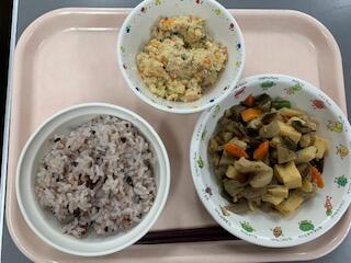 十六穀ごはんは、ひえやあわが入っていてプチプチとした食感を楽しめました。うの花は、しっとりしていて食べやすく、しっかり目の味付けだったのでとてもおいしかったです。(コロッケの中身ですよね?と言っていた児童もいました。)家ではあまり出てこないそうで、新しい味に舌鼓を打っていました。煮しめは具材が小さく切ってあり、味が染みていて、おいしかったです。