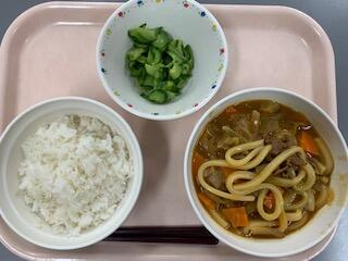 今日はみんなの待ちに待ったカレーうどんです。保育所生はずっと「うまそーう!」とはしゃいでいました。干し椎茸のだしが効いていて、牛肉のコクがなんとも言えないおいしさでした。今日の牛肉は宮崎牛です。みんな、かみしめて食べていました。たたききゅうりはさっぱりした味付けに、豆板醤もピリッと効いていて、とってもおいしかったです。
