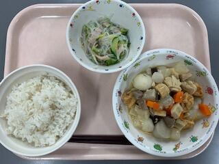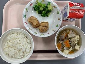 今日の鶏肉は、宮崎県産のじどっこです。歯ごたえがあって噛めば噛むほどうま味がでます。煮物は、そのまま煮物として食べたり、ご飯にかけて親子丼(卵なし)にして食べたりしていました。いももち汁は、もちっとしたお団子のような感じで食べ応えがありました。とろみもついていたので、最後まで温かく食べられました。