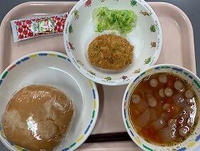 今日は子どもの大好きなケチャップ味のハンバーグです。ふわふわで、ごはんによく合います。おかわり争奪戦は1・2年生の圧勝でした。オニオンスープはベーコンの脂がとけだしていてコクがあり、やさしい味わいでした。