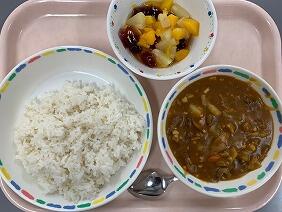 今日はみんなの大好きなポークカレーです。甘めの味付けで、ジャガイモや豚肉もたっぷり入っていて食べ応えがありました。保育所生も児童も、いつもよりご飯を多めに食べました。(何人かは顔や服にカレーをつけていました。)フルーツは甘くて冷たくて、とってもおいしかったです。