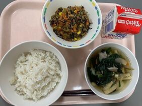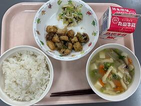 今日のごはんは、本校職員のご実家でとれたお米を使っています。もちもちしていて、とてもおいしかったです。塩昆布和えは、白菜とえのきが優しい味で和えてあり、箸休めにピッタリでした。白菜の食感も楽しめました。ぶりのねぎソース和えは、ぶりがやわらかくてごまとごま油の風味が香ばしく、食欲をそそりました。ごはんによく合い、子どもたちもパクパク食べていました。