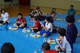 体育館にブルーシートを張り、みんなで輪になって食べました。普段の2倍の数で食べた