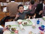両親も一緒に給食を食べていただきました。Sくんは、給食の椎葉牛サイコロステーキをぺろ
