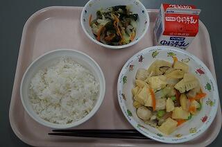 麦ごはん 甘酢和え 鶏肉のうま煮