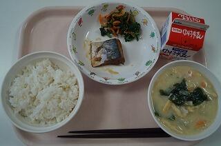 麦ごはん さばしょうが煮 ごま和え 五目汁