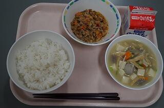 麦ご飯 ワンタンスープ 豚肉のケチャップ炒め