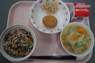 ひじきごはん 添えもやし メンチカツ 肉団子スープ