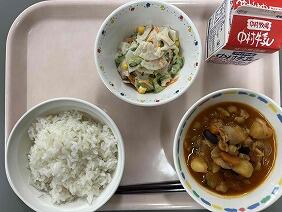 今日は、椎葉村から提供していただいた宮崎牛を使ったビーフカレーです。おいしい牛肉の脂がルウに溶け込んで、コクのあるカレーになっています。牛肉はもちろん柔らかくて食べ応えがありました。子どもたちも、「いつものカレーとは違うッ!」とうなっていました。ゼリー和えは冷たくて甘くて、今日はあっという間に全員完食でした。