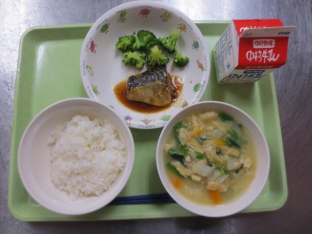麦ご飯 ・ ご汁 ・ サバのみぞれ煮 ・ ブロッコリー