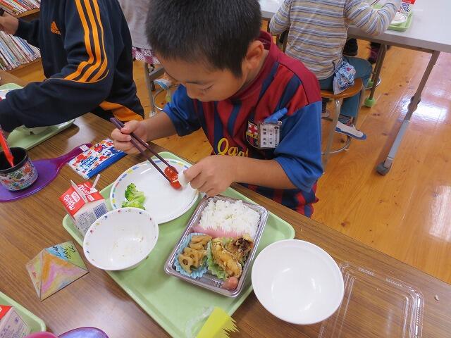 今日は、村内一斉弁当詰めの日です。1学期はおにぎりづくりに挑戦しました。今回は、給食のおかずをお弁当箱につめていきます。