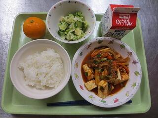 麦ご飯 ・ 豆腐のチリソース煮 ・ チーズサラダ ・ みかん