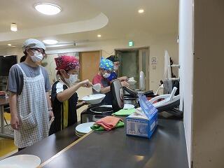 入所式が終わったらすぐに夕食づくりです。1・2・3年生はサラダを盛り付けます。