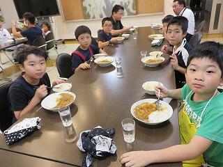 4・5・6年生はカレーづくり。かわるがわる鍋をのぞき込みます。
