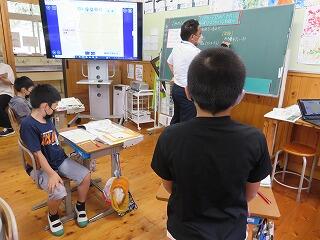 先生がもう一方の学年を教えている時は、画面を見ながら自分たちで学習を進めます。3年生でも自分たちで立派にやります。