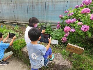 1年生と2年生が、自分たちで植えた野菜の観察をしていました。タブレットパソコンで写真を撮ります。