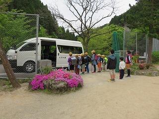 大河内小学校の朝は、全員でのあいさつから始まります。徒歩通学の子たちがスクールバスの子たちを迎えます。