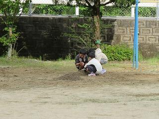 そこに近付く1・2年生。上級生より早く授業が終わったので、先に運動場に出てきて遊んでいたのです。