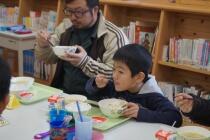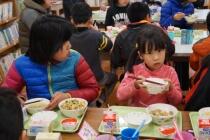駅伝大会後は「もちつき」を行い、お母さん方が作ってくれた豚汁や山菜おこあ、赤飯とつきたてのおもちをおいしくいただきました。