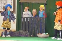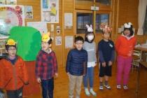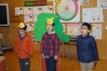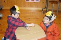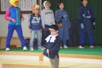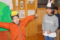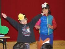 1年生のSくんがひよこ役、2年生のSくんがきつね役、もう一人の2年生Nくんはナレーター役で、おおかみやうさぎ、あひる役は3,4年生が友情出演しました。
