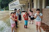 圧倒的な強さで小崎小が勝ちました。その後は、スイカのご褒美です。みんな、種を飛ばし