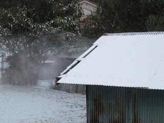 藤棚のベンチも運動場も真っ白。雪の中を登校です。