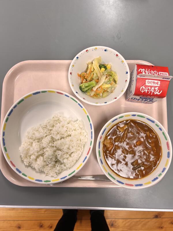 今日はみんなの大好きなポークカレーです。大河内小のカレーには、ひきわり大豆が入っていることが多く、食べ応えがあります。たっぷりつがれたカレーを見て、満面の笑顔の子どもたち。根菜サラダも、ごぼうやレンコンがシャキシャキしていておいしかったです。