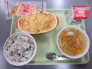 今日は、6年生が小学校で食べる最後の給食です。そこで、大河内小学校で大人気のマカロニグラタンにしました。子どもたちはとっても嬉しそうにグラタンを食べていました。