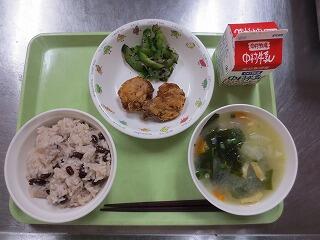 今日は、今年度最後の給食になりました。4月からは一つ上の学年に上がりますので、お祝いの意味を込めて、今日は赤飯とから揚げでした。子どもたちは、大好きなから揚げを喜んで食べていました。